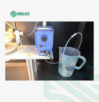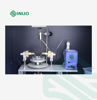 The working principle of the leakage tracking test (tracking index testing) is that the conducting liquid (0.1%NH 4 CL) of required volume in the required height (35mm) and required time (30s) drops with the voltage between the platinum electrodes (2mm × 5mm ) on the surface of solid insulating material. Thus the users evaluate the tracking resistance performance of solid insulating material surface under the combined influence of electric field and humid or contaminate medium. In a word, this device is used to measure the compare tracking index (CT1) and electrical resistance index(PT1).